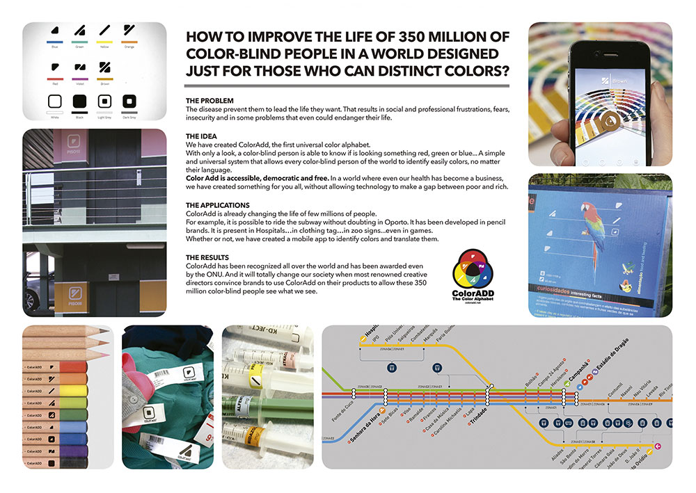 ColorADD – The color alphabet has been internationally recognized and acclaimed by the ONU due to its capacity to reduce inequalities around the world. The Color alphabet App is available and free in App Store so colorblind people can detect colors in their daily life. A very usefull and inclusive tool so they can defferentiate the color of a underground line, a red light or even a supermarket product, alone by themselves.